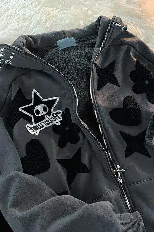 Cozy flocked zip-up hoodie for women with letter print, drawstring hood, and loose fit for autumn/winter. Available in apricot and dark grey (S–2XL, Asian sizing—runs small). Plush interior, full front zipper, casual style.