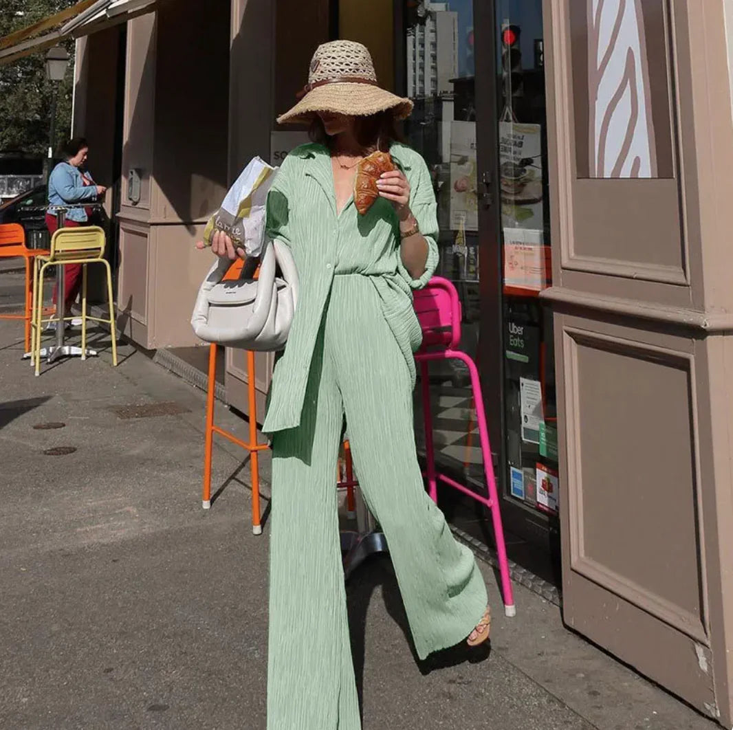 Set fluido de color sólido con top holgado y pantalón plisado a juego. Elegante y cómodo, ideal para días casuales, viajes o tardes relajadas.