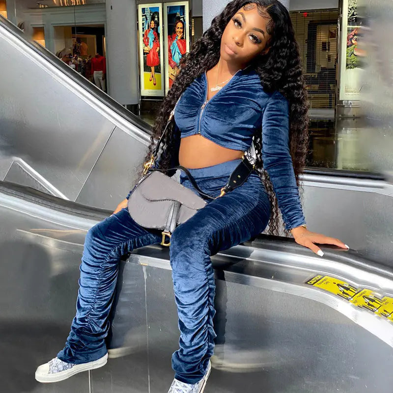 Conjunto de crop top con capucha y manga larga + pantalón ajustado tipo lápiz, confeccionado en terciopelo coreano suave y duradero (91%-99% poliéster, 10% spandex). Diseño cómodo y moderno, ideal para salidas casuales o looks de tendencia. Disponible en azul y tallas S, M y L.