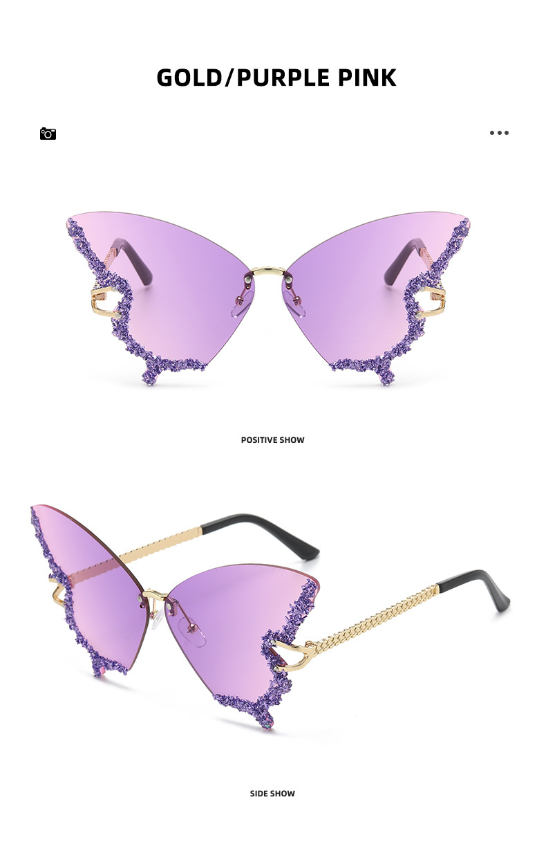 Step into the spotlight with our stunning Butterfly Sunglasses, designed for the modern woman who loves to make a statement. These vintage large rimless sunglasses are not just an accessory; they are a fashion statement that embodies elegance and style. Adorned with sparkling rhinestones, they capture the essence of glamour and sophistication.