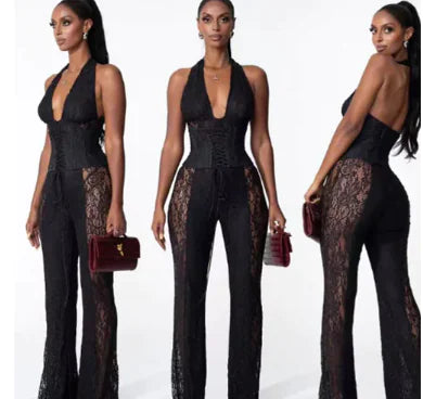 Mono de una pieza con escote halter chic y diseño negro sofisticado. Su favorecedor escote en V realza la silueta, mientras que el tejido cómodo y transpirable garantiza confort durante todo el día. Perfecto para fiestas, eventos formales o salidas casuales.