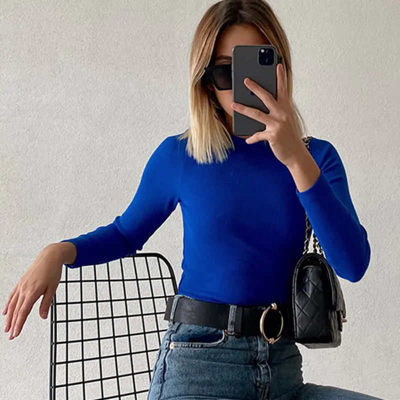 Top ceñido de manga larga con cuello redondo y textura de canalé. Ideal para primavera, perfecto para usar solo o en capas.