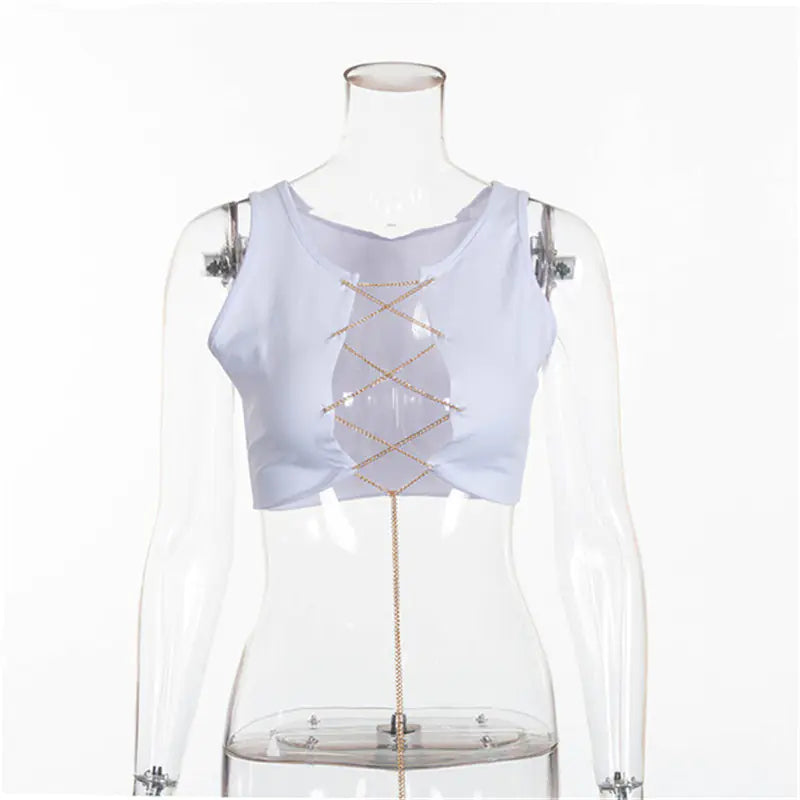 Top ceñido sin mangas que realza la silueta y ofrece suavidad y comodidad gracias a su tejido de chenilla con spandex. Fresco y versátil, ideal para cualquier ocasión.