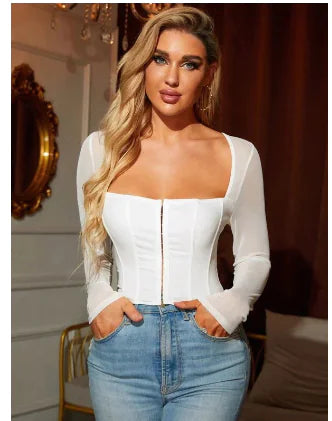 Top Corto con Cremallera y Cuello en U de Manga Larga para Mujer