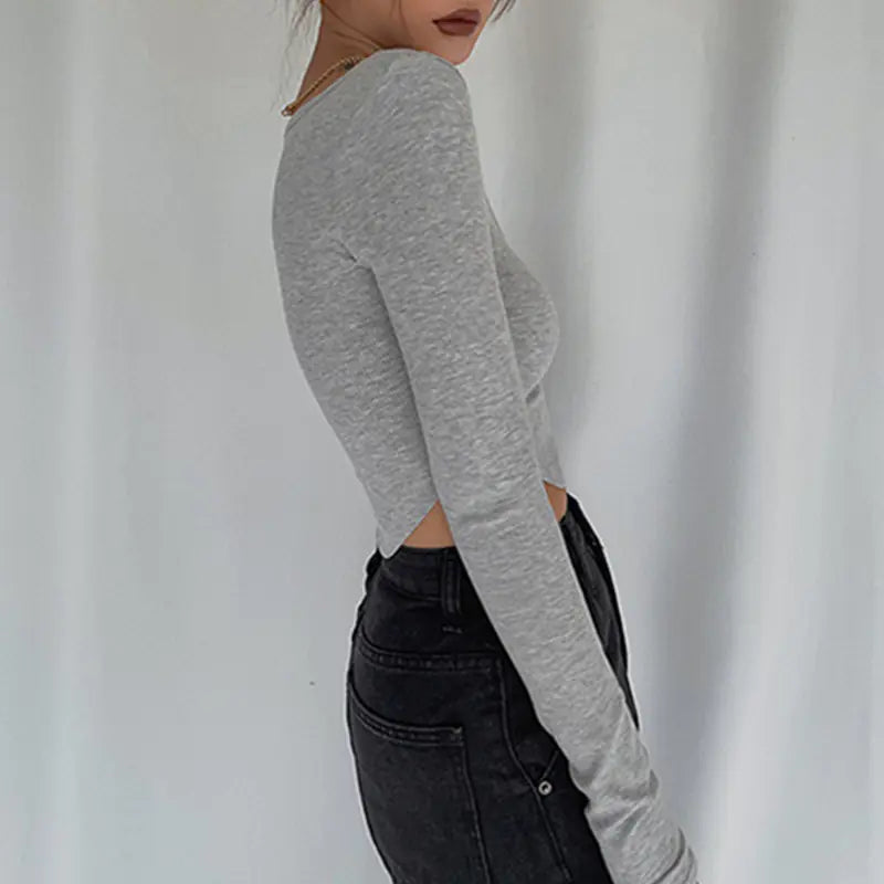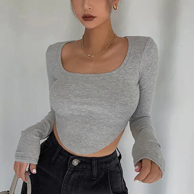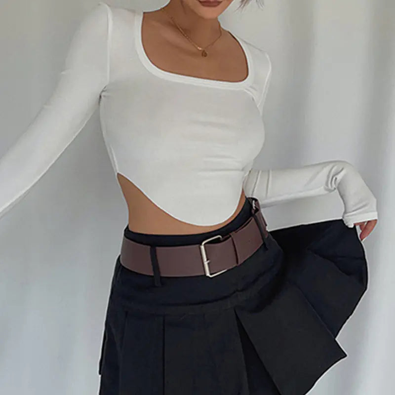 Top de manga larga con cuello cuadrado y bajo irregular para un toque moderno. Ajuste ceñido que realza la silueta, confeccionado en poliéster suave y duradero.