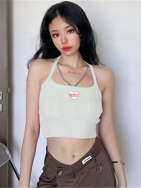 Top de punto acanalado con tirantes finos y detalle de cadena metálica. Bordado de carta de amor que añade un toque divertido y chic. Silueta ajustada que realza la figura, ideal para días de calor o salidas nocturnas.