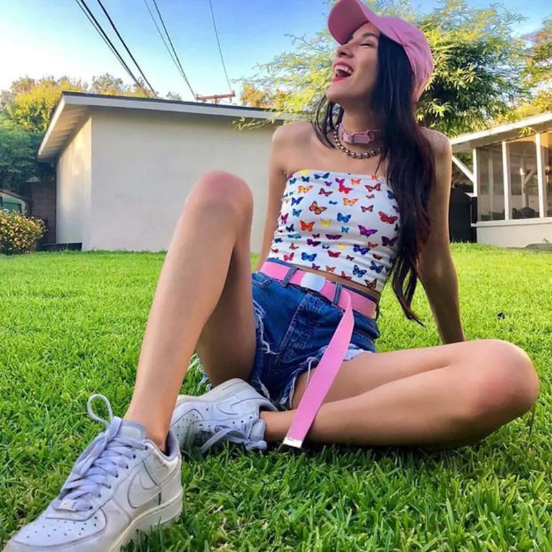 Top sin tirantes con estampado de mariposas en color blanco. Corte ajustado que realza la silueta, confeccionado en tejido ligero y cómodo. Ideal para combinar con faldas o pantalones.